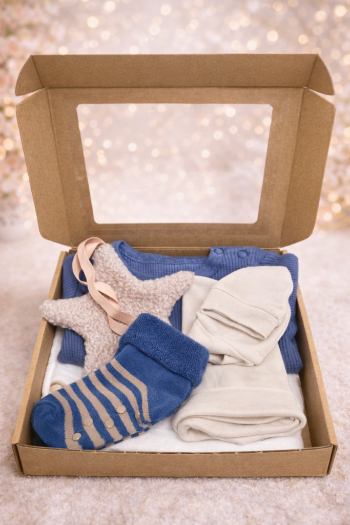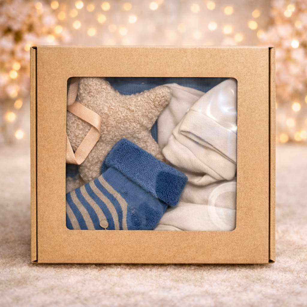 Piękny mini niebieski babybox, gotowy na prezent, zapakowany w ozdobne pudełko. To idealny wybór zarówno na pierwsze odwiedziny u noworodka, jak i praktyczny początek wyprawki dziecięcej. Zachwyci nie tylko maleństwo, ale także jego rodziców.