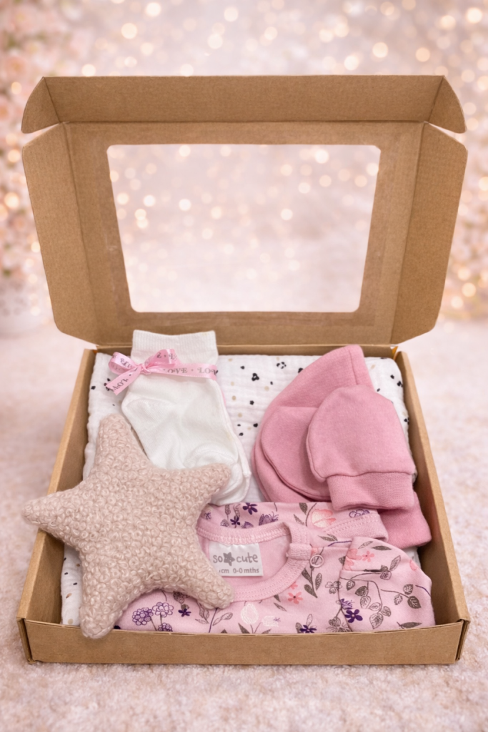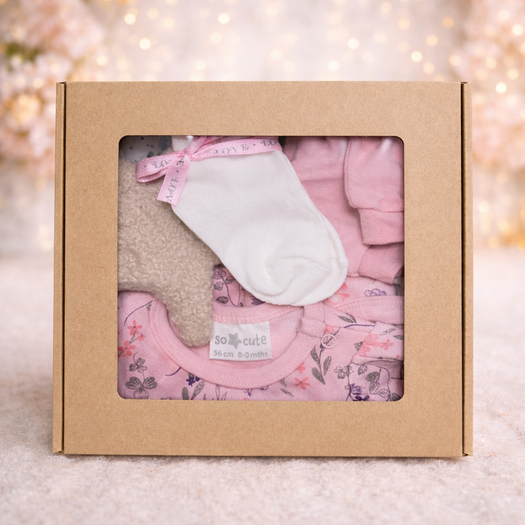 Piękny mini różowy babybox, gotowy na prezent, zapakowany w ozdobne pudełko. To idealny wybór zarówno na pierwsze odwiedziny u noworodka, jak i praktyczny początek wyprawki dziecięcej. Zachwyci nie tylko maleństwo, ale także jego rodziców.